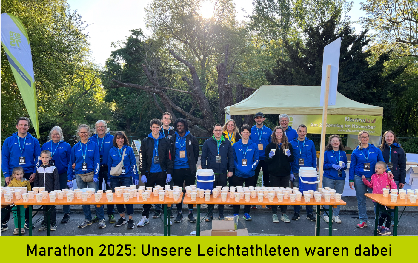 Schon um 6 Uhr morgens waren die SFDler am Start, um den 100 Meter langen Verpflegungsstand aufzubauen. Danach wurden Tausende Becher mit Wasser gefüllt, Iso- und Magnesium Getränke angerührt und ausgeschenkt, Bananen geschnitten und verteilt und Schwammbecken befüllt. Die Halbmarathonis waren die ersten die um 8.30 Uhr den Verpflegungsstand passierten und um 10.55 Uhr kamen dann die ersten Marathonis nach 1.25,34h am Verpflegungspunkt vorbei. Um ca. 14.00 Uhr war Feierabend und nach einem tollen sportlichen Ereignis.