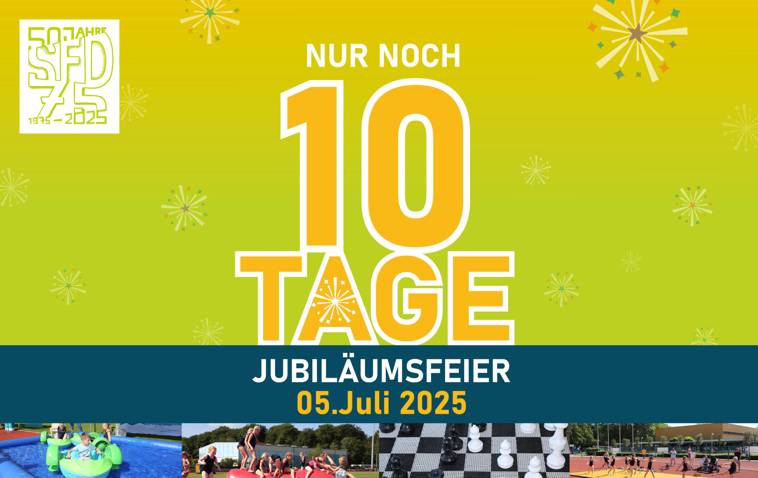 Jetzt geht es in die heiße Phase! In nur zehn Tagen findet unsere große Jubiläumsparty im Sportpark Niederheid statt. Kommt am Samstag, den 5. Juli von 12 – 16 Uhr vorbei und freut Euch auf jede Menge, Spaß, Sport, Spiel und Action!