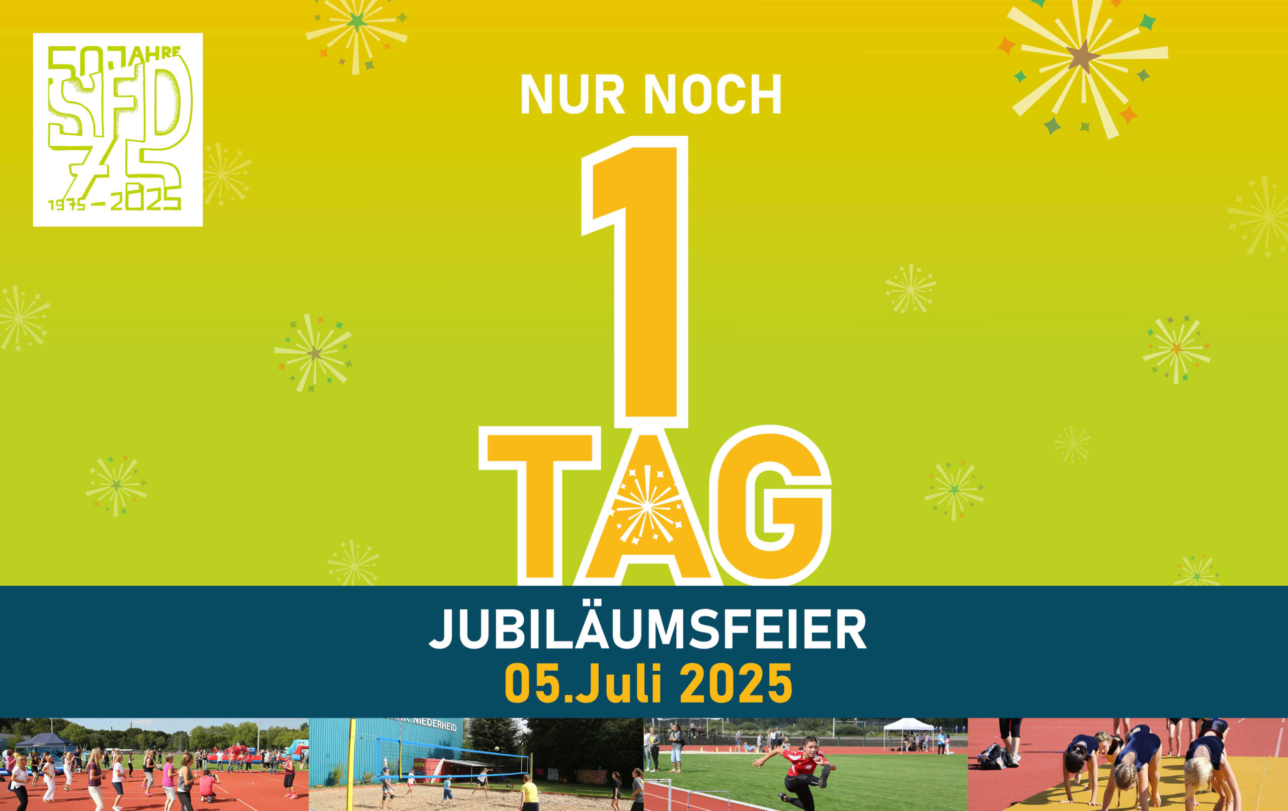 Einmal werden wir noch wach, dann ist der große Partytag! Morgen um 12 Uhr beginnt die große Jubiläumsparty „50 Jahre SFD ´75“ im Sportpark Niederheid. Wir haben ein abwechslungsreiches Programm auf die Beine gestellt: Unsere Fachabteilungen stellen sich vor, es gibt Mitmachstationen unserer Partner Barmer, Bädergesellschaft, Sportactionbus und ISC Rams, dazu Musik, Essen und Trinken.