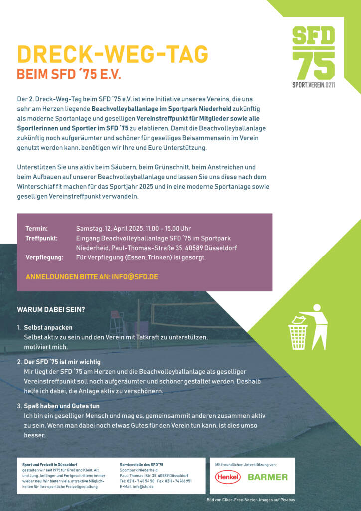 Wir räumen wieder gemeinsam im Sportpark Niederheid auf! Nach dem großen Erfolg beim ersten Dreck-Weg-Tag 2023 machen wir in diesem Frühjahr weiter! Am 12. April treffen wir uns wieder und räumen gemeinsam auf unserer Vereinsanlage auf. Der Schwerpunkt liegt dabei wieder auf unserer vereinseigenen Beachvolleyballanlage. diese liegt uns sehr am Herzen, wir möchten sie als moderne Sportanlage und geselligen Vereinstreffpunkt für Mitglieder sowie alle Sportlerinnen und Sportler im SFD ´75 etablieren. Damit die Beachvolleyballanlage zukünftig noch aufgeräumter und schöner für geselliges Beisammensein im Verein genutzt werden kann, benötigen wir Ihre und Eure Unterstützung.