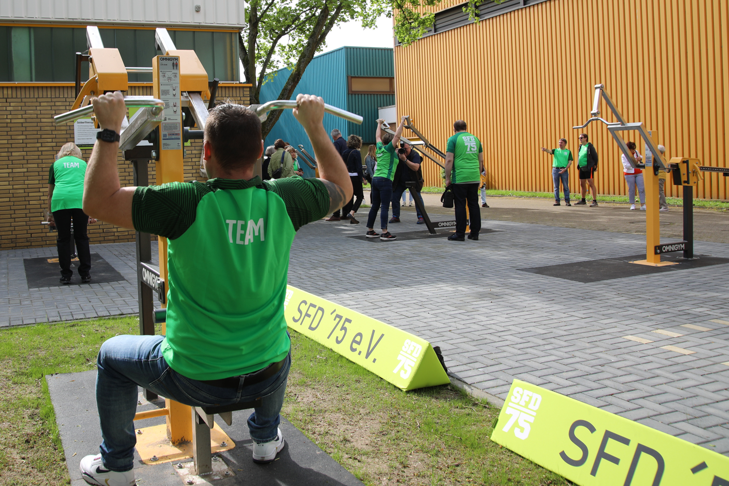 Der SFD ’75 e.V. konnte mit Mitteln aus dem Förderprogramm „Moderne Sportstätten 2022 – Programmaufruf II“ im Sportpark Niederheid die Neuerrichtung eines Outdoorfitnessgerätezirkels mit zehn witterungsbeständigen und ganzjährig nutzbaren Outdoor-Fitnessgeräten „OMNIGYM“ der Firma Kübler Sport GmbH realisieren, von denen vier behinderten-/rollstuhlgerecht und barrierefrei nutzbar sind. Die Projektkosten beliefen sich auf rund 93.000 Euro.