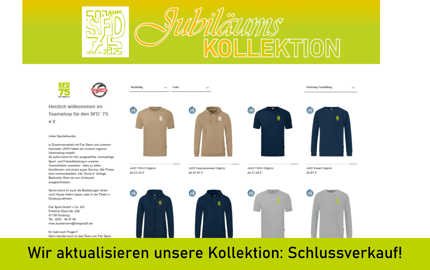 Wir aktualisieren gemeinsam mit unserem Partner JAKO unsere Vereinskollektion. Ab April haben wir neue Shirts, Hosen, Kapuzenpullis und vieles mehr im Angebot. Wer aber noch Teile unserer schönen Jubiläumskollektion oder die bisherigen Kleidungsstücke kaufen möchte, kann das noch bis Ende März tun. So lange ist die bisherige Kollektion noch bei JAKO bestellbar.