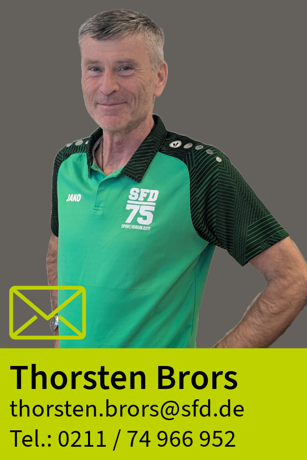 Thorsten Brors informiert über die vielfältigen Sportmöglichkeiten im SFD ´75, organisiert alles rund um Kursbuchungen und Bescheinigungen für die Krankenkassen. Er kümmert sich um den Mitgliederservice, ums Ehrenamt und plant Kooperationsprojekte.