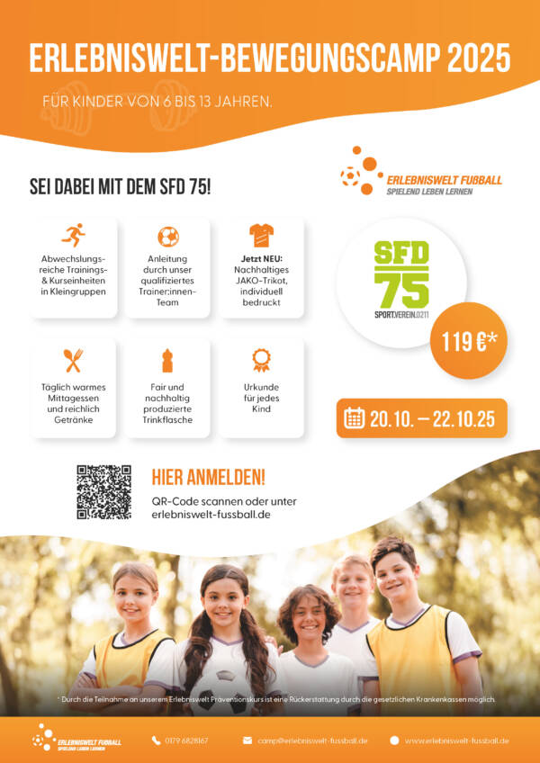Wir machen Ferien zum Erlebnis! Gemeinsam mit unserem Partner der Erlebniswelt Sport- und Fußballschule bieten wir regelmäßig Feriencamps an und bringen Kinder in Bewegung. Unser professioneller Partner organisiert eine abwechslungsreiche Ferienbetreuung, bei der garantiert keine Langeweile aufkommt. 2025  fanden bereits zwei Camps in den Osterferien und den Sommerferien statt, jetzt bieten wir ein weiteres für den Herbst an.