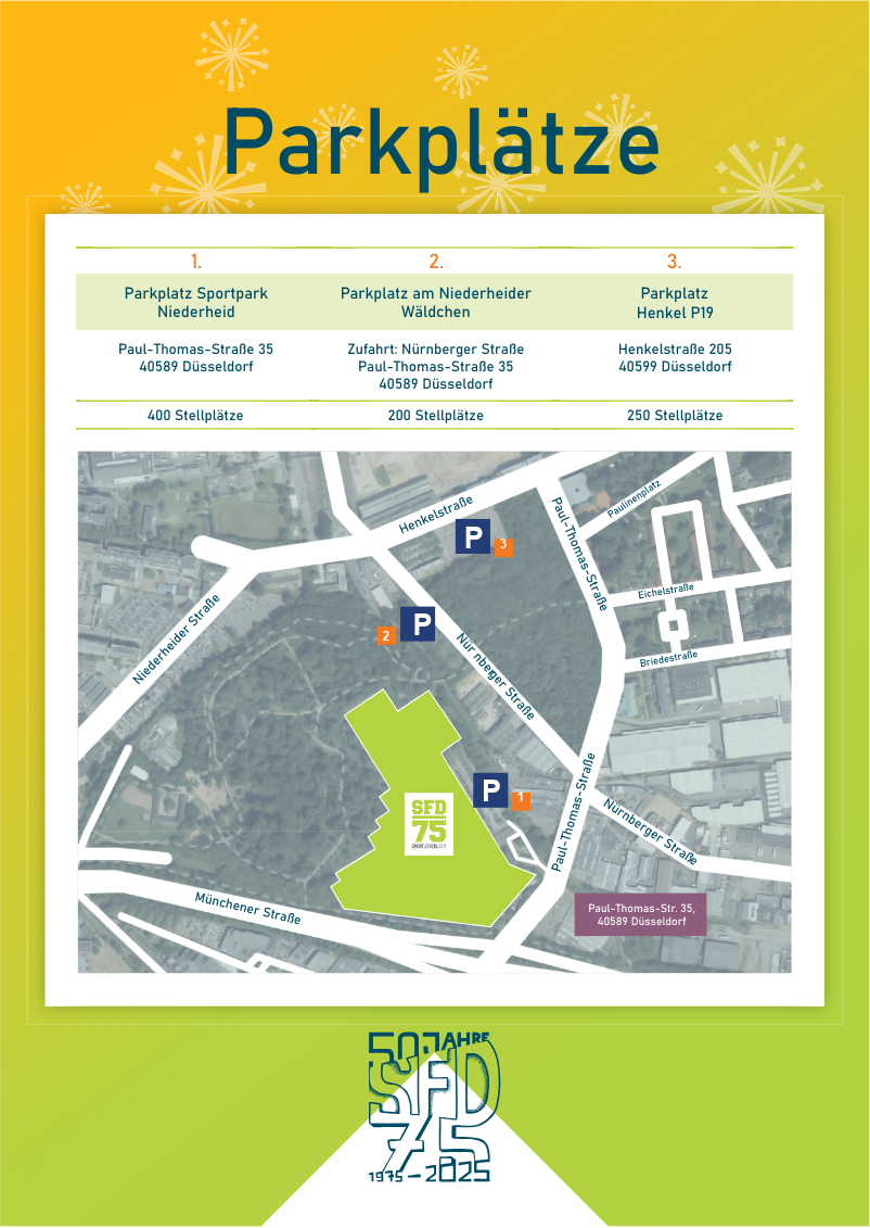 Der Countdown läuft. Am Samstag ist endlich der Tag, auf den wir schon so lange hin fiebern. Am 5. Juli feiern wir von 12 bis 16 Uhr die große Jubiläumsparty 50 Jahre SFD ´75. Wir hoffen, ihr reist aus allen Teilen der Welt an und verbringt mit uns einen unvergesslichen Tag im Sportpark Niederheid.