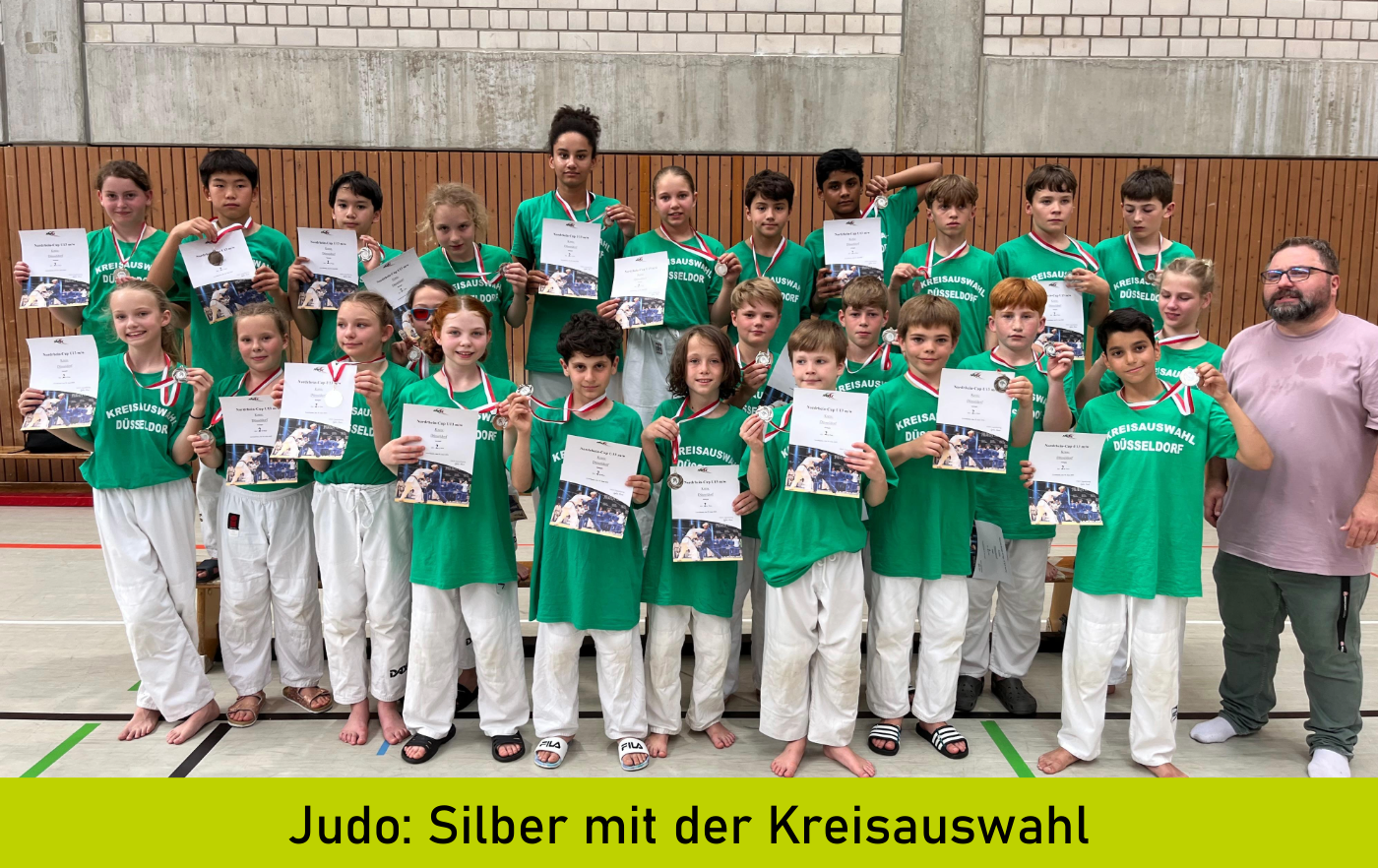 Hayden Keuter und Max Albin holen Silber mit der Kreisauswahlmannschaft beim Nordrhein-Cup. In Leverkusen fand am letzten Wochenende der Nordrhein-Cup für Kreisauswahlmannschaften der männlichen und weiblichen Jugend U13 statt. Unsere Judoka Hayden und Max wurden für die Mannschaft des Judokreises Düsseldorf nominiert. Im ersten Duell gab es einen klaren 10:4-Sieg gegen Bonn, darauf folgte ein 11:5-Erfolg gegen Aachen und ein überzeugender 9:6-Sieg gegen Köln. Im Finale kam es zum Showdown gegen den Titelverteidiger Bergisches Land. Nach einem 8:8 in der regulären Zeit ging es in die Verlängerung: Ein Sieg, aber leider zwei knappe Niederlagen sorgten für den Endstand 10:9 für den Kreis Bergisches Land.