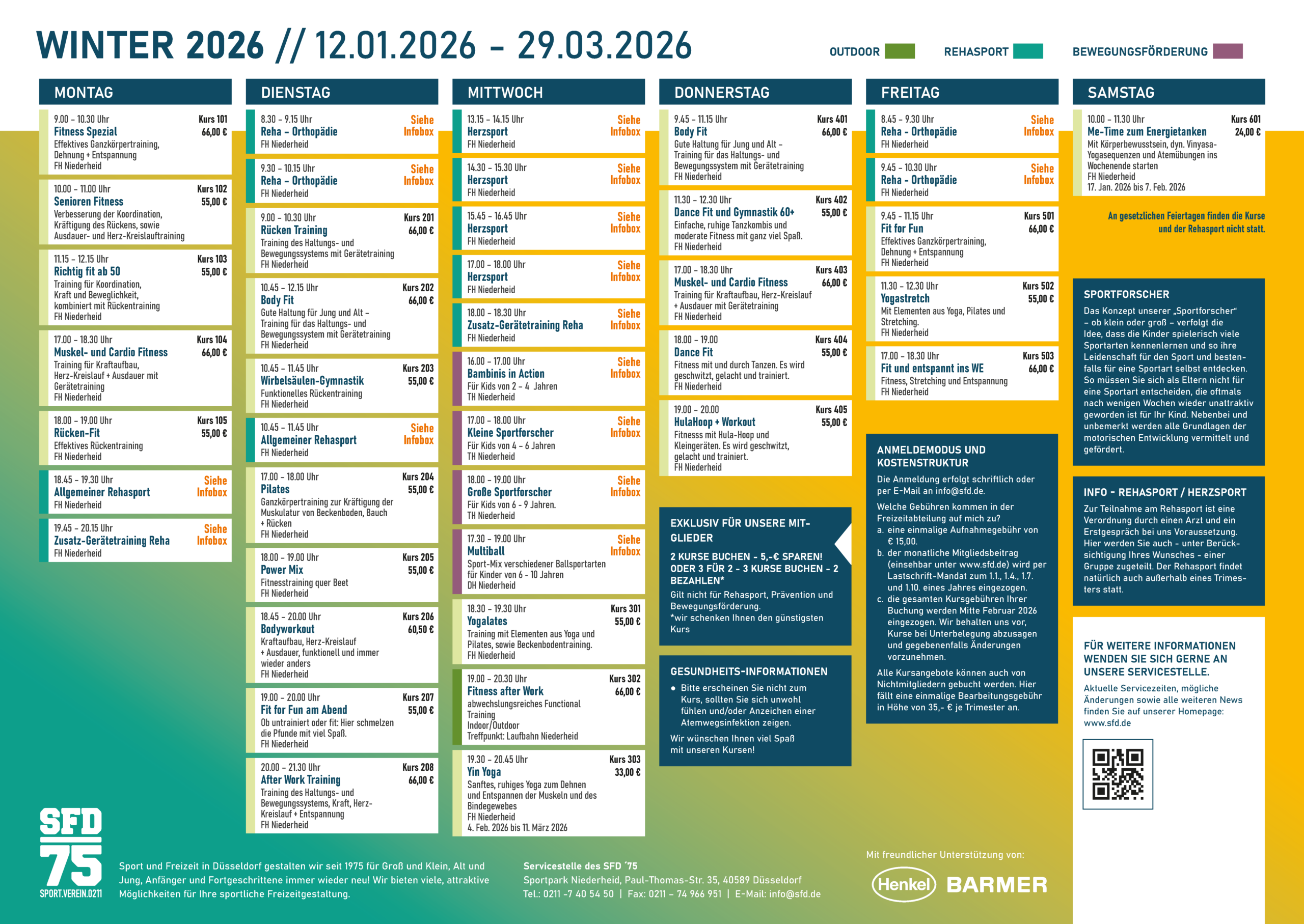 Unser Kursprogramm bietet die Abteilung Freizeit & Gesundheit an. Mit der Gründung der Abteilung Freizeit- und Gesundheitssport ging der SFD ’75 neue, erfolgreiche Wege. Das Kurssystem in Trimestern ermöglicht eine kundenorientierte „Fitness à la carte“, das bedeutet, unsere Mitglieder können sich saisonal ihr Freizeitsportprogramm zusammenstellen und zahlen nur bei entsprechender Nutzung. Damit füllt der SFD ’75 das Marktsegment zwischen dem klassischen Sportverein und den kommerziellen Fitness-Centern.