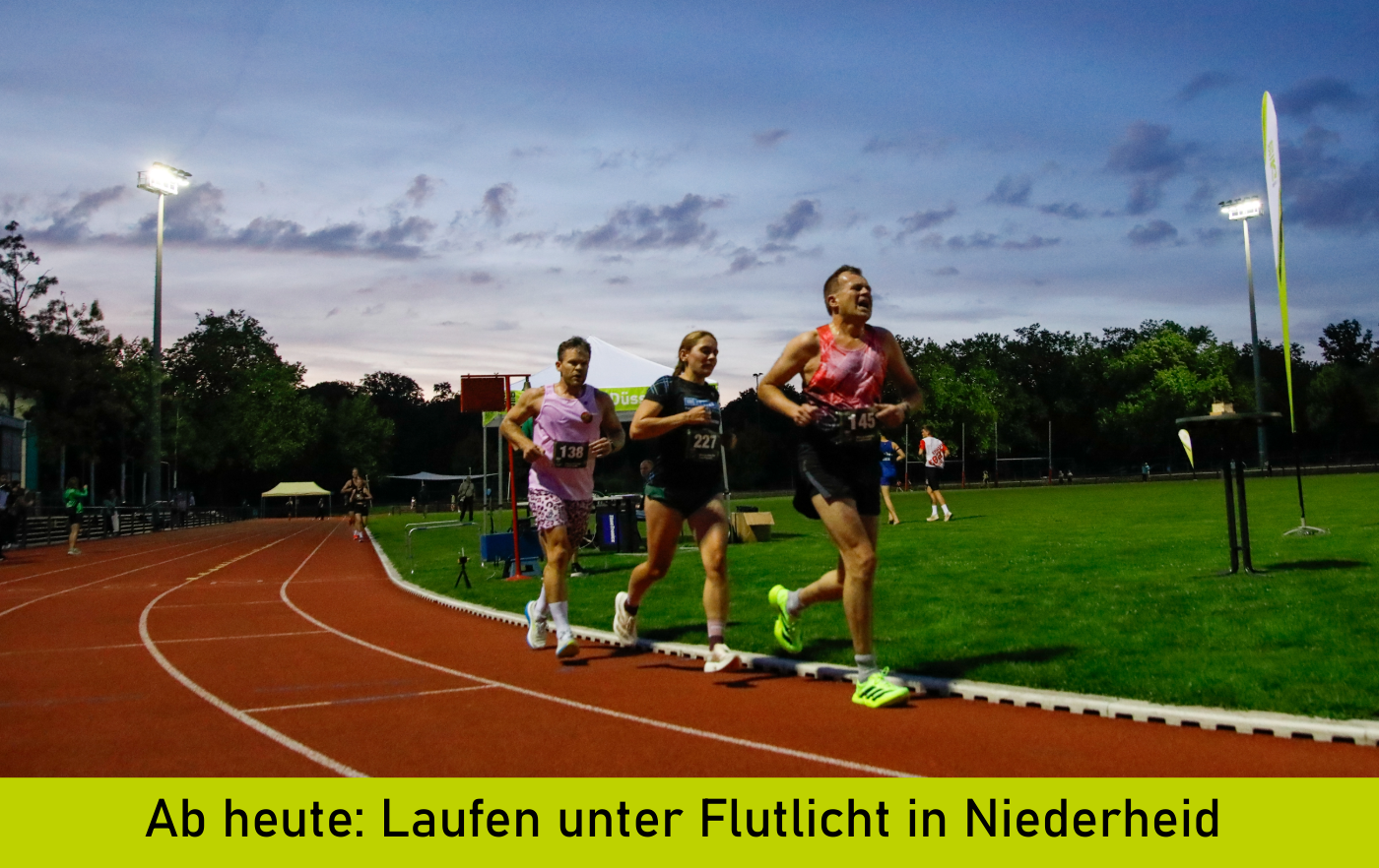 „Laufen unter Flutlicht“ ermöglicht es Laufbegeisterten, auch in den Wintermonaten dem beliebtesten Freizeitsport Deutschlands nachzugehen. Auf einigen Bezirkssportanlagen wird zu bestimmten Zeiten in der Woche die Beleuchtung eingeschaltet, sodass Sie unter optimalen Bedingungen trainieren können, auch wenn es früh dunkel wird. Im Sportpark Niederheid gibt es das Angebot immer montags und mittwochs von 18 bis 20 Uhr. In dieser Zeit ist das Flutlicht and der Laufbahn eingeschaltet.