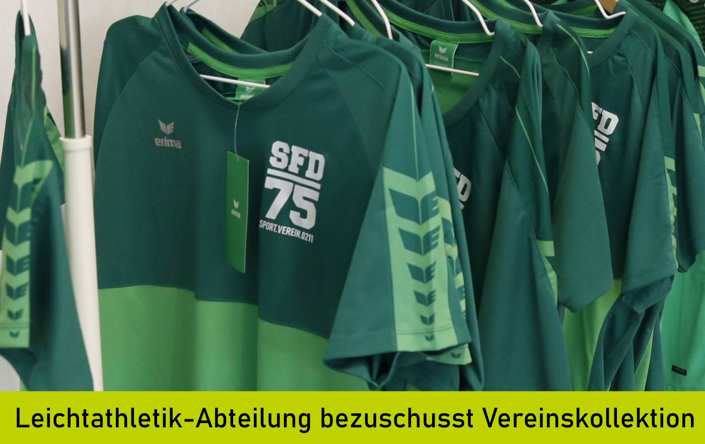 Um eine einheitliche Optik bei Vereinsauftritten, auf Wettkämpfen und anderen Veranstaltungen zu erzielen, ist es erforderlich, dass die Mitglieder der Fachabteilung Leichtathletik ausschließlich die im SFD Online-Shop erhältlichen Artikel der Firma ERIMA und insbesondere auf Wettkämpfen ein grünes Trikot (Oberteil) mit SFD‘ 75 Logo