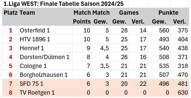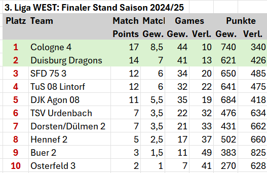 Mit 6 Siegen aus 12 Spielen belegt die dritte Mannschaft einen sehr soliden 3. Platz in Liga 3. Die erste Mannschaft verpasst in einem packenden Finale im letzten Spiel um einen Punkt den Klassenerhalt in Liga 1 & kann an das sehr gute Ergebnis aus der letzten Saison leider nicht anknüpfen. Besonders erfolgreich konnte jedoch die zweite Mannschaft ihre Saison abschließen. Mit einer überaus dominanten Leistung sicherte sie sich den ersten Platz in Liga 2, verteidigt damit ihren Titel aus der Vorsaison und wird somit nächste Saison erstklassig spielen.