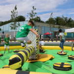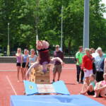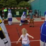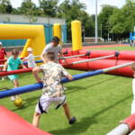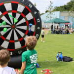 Auf dem Rasenplatz im Sportpark standen zwei riesige Menschenkicker, in denen sich Kinder und Erwachsene als lebende Kickerfiguren versuchen konnten. Der Sportactionbus war mit Kletteranhänger und Surfsimulator vor Ort, aber vor allem unsere Fachabteilungen haben für jede Menge Action gesorgt. Dafür gab es die SFD-Challenge. Das waren 12 kleine Herausforderungen von Badminton bis Pickleball, von Fußball bis Leichtathletik, die unsere Fachabteilungen sich ausgedacht haben. Wer sechs davon absolvierte, erhielt beim Infostand eine Überraschung. Und Hunderte holten diese ab. In der Dreifachturnhalle zeigten unsere Judoka, was sie drauf haben und boten mit einem Turnier hunderten Zuschauern spektakuläre Action.