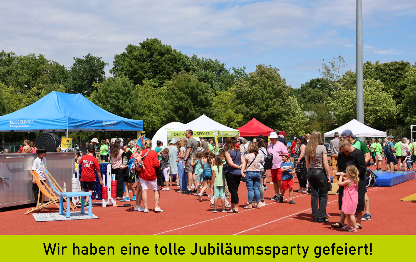 Das war ein Fest! Die große Jubiläumssause zum 50. Geburtstag des SFD 75 war ein voller Erfolg. Vier Stunden lang haben wir mit hunderten Gästen im Sportpark Niederheid gefeiert. Wir danken allen Helfern, unseren Partnern, Mitgliedern, Sponsoren und einfach allen, die da waren! Um 12 Uhr haben die beiden Moderatoren Lutz Grünwald und Piet Keusen die Party offiziell eröffnet. Mit Musik, Sport und jeder Menge Attraktionen wurde der Geburtstag dann ein rundum gelungenes Familienfest.